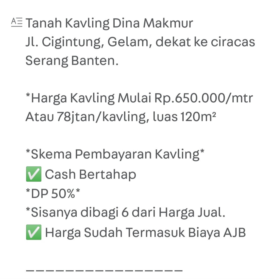 Tanah Kavling Dina Makmur, Cigintung, Gelam-Ciracas Serang Banten Jan 29 20222 Mei 2022 17 Menit dari alun-alun Kota Serang Info Kavling Lainnya Bagikan ini: Bagikan ke X(Membuka di jendela yang baru) X Bagikan pada Facebook(Membuka di jendela yang baru) Facebook Suka Memuat... Terkait Diterbitkan oleh Serang Infos Lihat semua pos milik Serang Infos